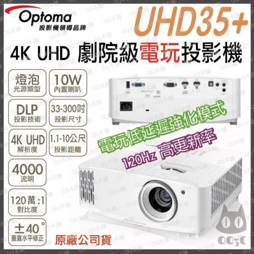 《 免運 原廠 送 HDMI線材 》Optoma 奧圖碼 UHD35+ 4K UHD 劇院級 電玩投影機 低延遲 投影機