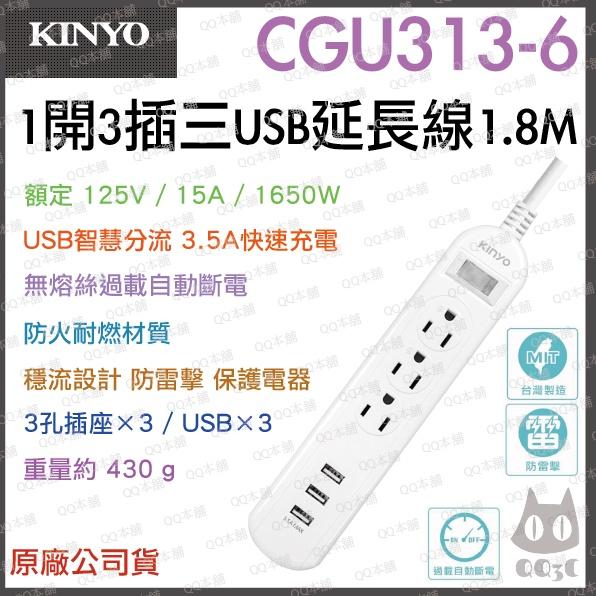 《 免運 現貨 附發票 6孔 180cm 》KINYO CGU313-6 1開 3插 3USB 安全 延長線 1.8M
