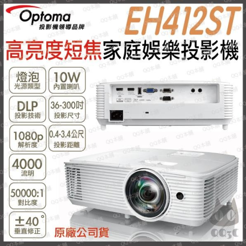 《 免運 原廠 送 HDMI 》Optoma 奧圖碼 EH412ST Full HD 高亮度 短焦 家庭娛樂 投影機