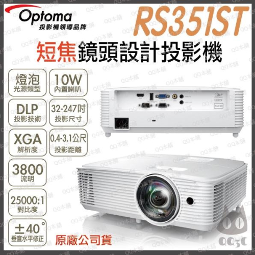 《 免運 原廠 送HDMI線材 》Optoma 奧圖碼 RS351ST XGA 短焦鏡頭設計投影機 短焦 投影機