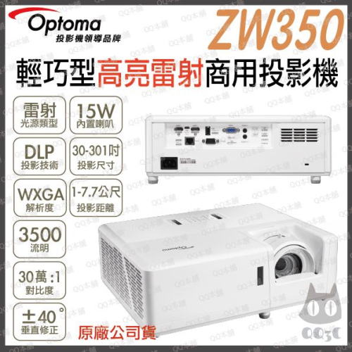 《 免運 原廠 送 HDMI線材》Optoma 奧圖碼 ZW350 WXGA 輕巧型 高亮 雷射 商用投影機 雷射投影機