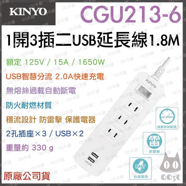 《 免運 現貨 附發票 5孔 180cm 》KINYO CGU213-6 3開 3插 2USB 安全 延長線 1.8M