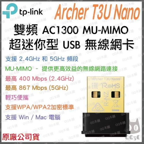 《 tp-link 原廠 公司貨 》Archer T3U Nano AC1300 MU-MIMO雙頻 無線 迷你 網卡