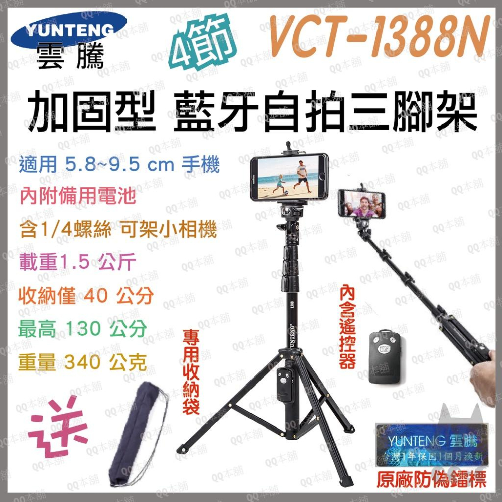 《 加固型 新款 藍牙自拍架 更長 更穩》YUNTENG 雲騰 VCT-1388N 藍牙自拍桿 藍牙自拍 三腳架