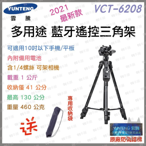 雲騰 VCT-6208 藍芽(手機/平板)三腳架+三向雲台 NCC認證碼授權碼 : CCAH17LP0940T1 新款 :送 收納袋、手機夾 遙控為電池版