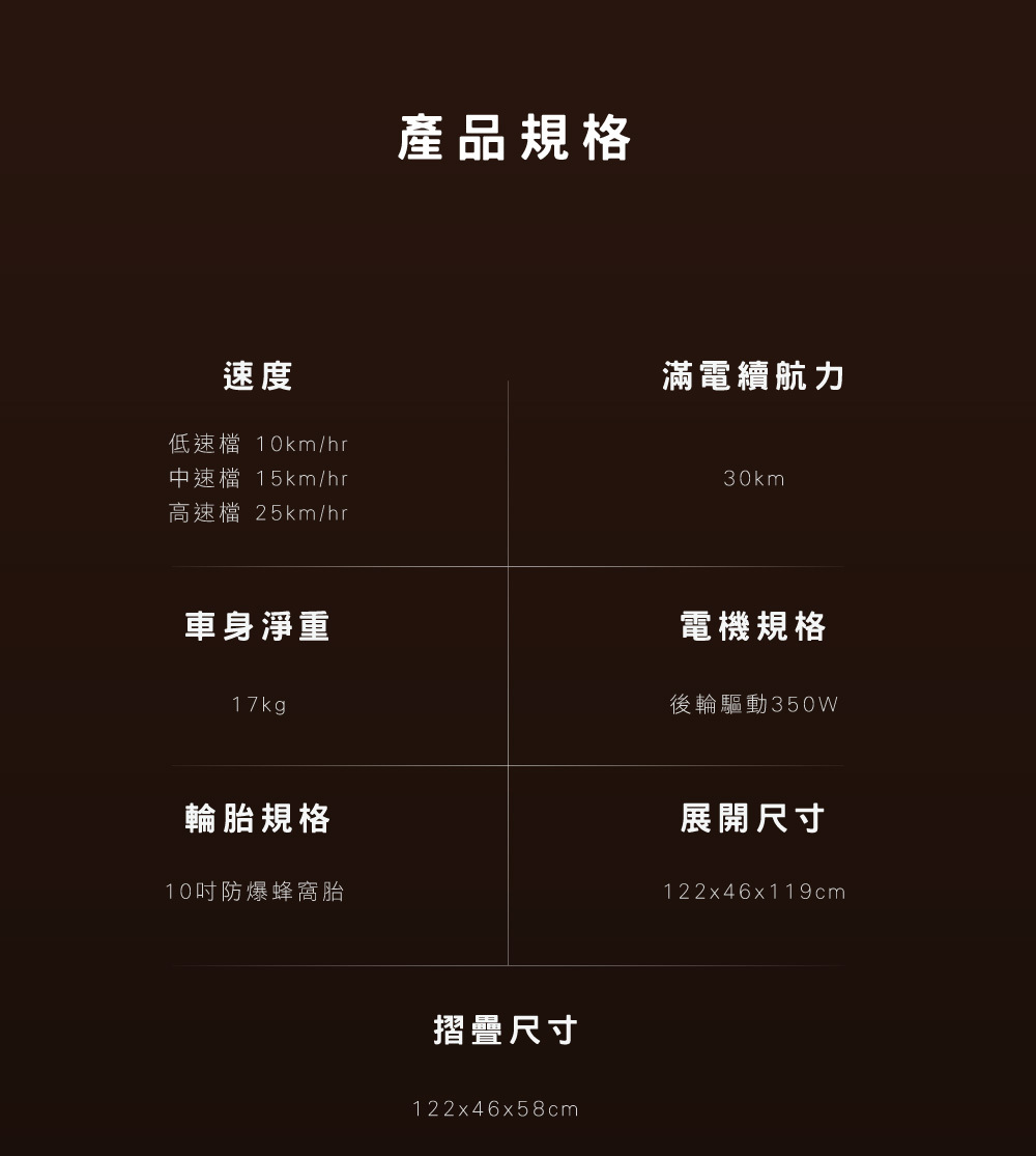 特殊規格:折疊器、前後輪減震設計、安全前後車燈、定速巡航功能