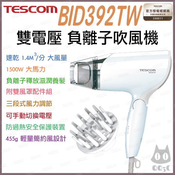 《 日本 TESCOM 台灣出貨 原廠公司貨 》BID392TW 超速乾 雙電壓 負離子 造型 吹風機 392