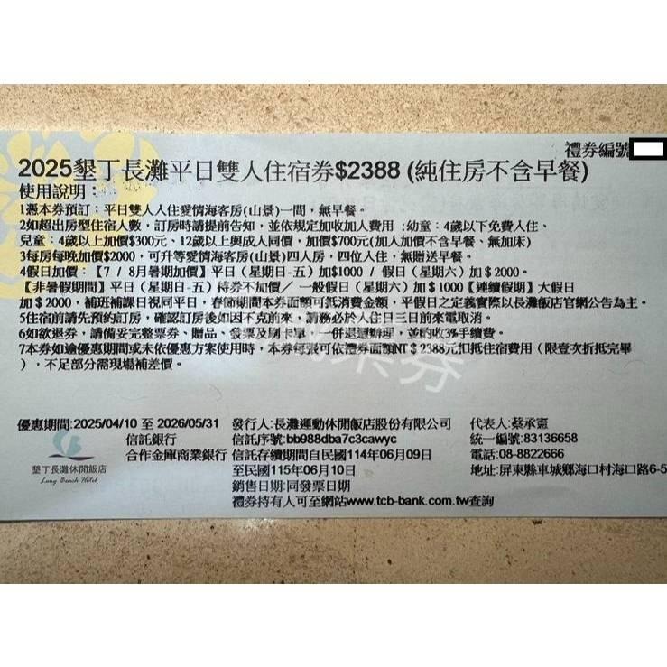 愛情海客房(山景)一間 雙人平日 含早餐二客、星空夜訪沙蟹活動2位,為響應環保,住房不提供一次性備品 如超出房型住宿人數,訂房時請提前告知,並依規定加收加人費用:幼童:4號以下免費人住、兒童:4歲以上加價$500元、12歲以上與成人同價,加價$100元(加入加價含早餐、不加床) 每房每晚加價$2000,可升等愛情海客房(山景)四人房,四位人住,贈送早餐4客、星空夜訪沙蟹活動2位。 假日加價:【7/8月暑期加價】平日(星期日-五)加$1000/假日(星期六)加$2000。 【非暑假期間】平日(星期日-五)将券不加價/一般假日(星期六)加$1000【連續假期】大假日加$2000,補班補課日視同平日,春節期間本券面額可抵消費金額,平假日之定義實際以長濃飯店官網公告為主。