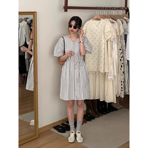 ☆現貨☆韓系V領條紋系帶連衣裙