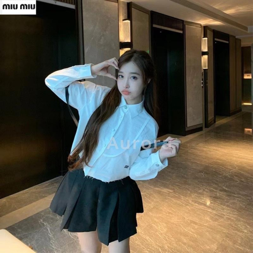 MiuMiu 新款 字母 刺綉 翻領 水鉆紐扣 減齡 短款 襯衫