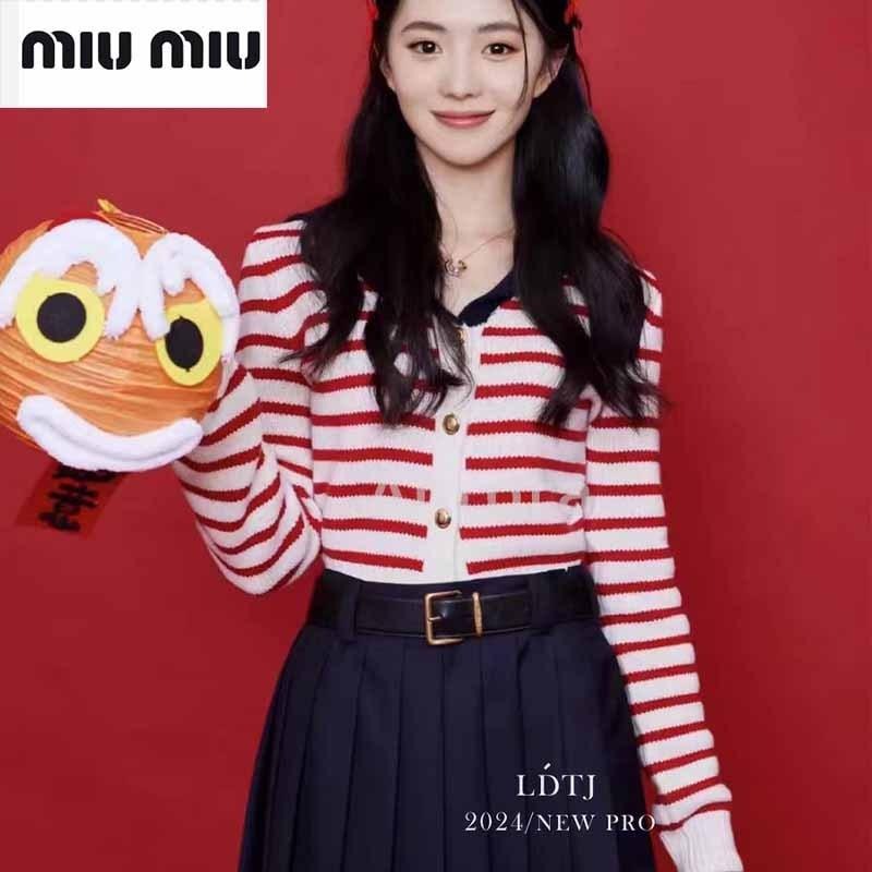 MIU MIU 法式 復古 條紋 軍領 針織 開衫女 春秋 新款 百搭 上衣