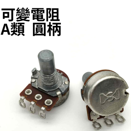松輝 A 類圓柄可變電阻,提供 A1K、A2K、A5K、A10K、A25K、A50K、A100K、A250K、A500K、A1M 多種阻值,適用於音量旋鈕、音響、效果器、樂器與各類電子電路 DIY 與維修使用。