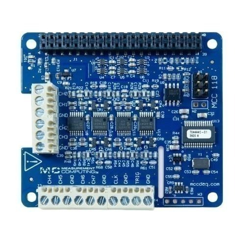 The MCC 118 and MCC 128 DAQ HATs feature eight channels of analog voltage measurement for Raspberry Pi-based data acquisition systems. Each device has a maximum sample rate of 100 kS/s for taking single point or waveform voltage measurements. Up to eight MCC HATs can be stacked onto one Raspberry Pi - providing up to 64 channels of data and a maximum throughput of 320 kS/s.