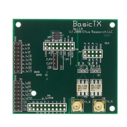 Product Description: The BasicTx daughterboard is a low-cost daughter board that provides transmission capability from the USRP from 1 to 250 MHz. The BasicTx uses two wideband transformers to match the dual DAC outputs of a USRP to 50-ohm SMA connections. The wide bandwidth of the BasicTx board allows the USRP to operate in a subsampling mode when the desired output frequency is beyond the sampling clock rate of the USRP DACs. Each output of the BasicTx can be operated independently, or combined into a single I/Q pair. Note that appropriate filtering should be utilized in subsampling modes. Example applications include transmitters with external RF front ends direct generation of baseband of passband signals and custom daughtercard development