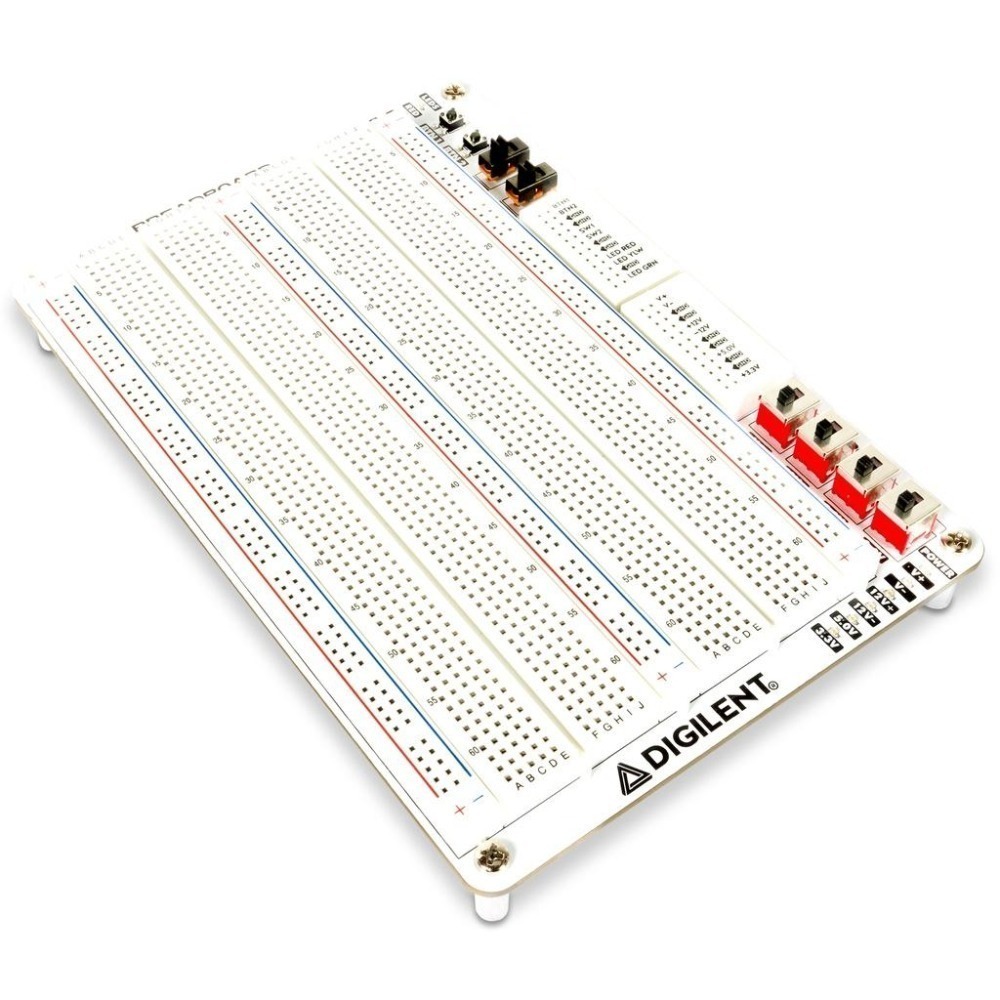 The Analog Discovery Canvas provides a convenient and portable prototyping surface that can be used with the Analog Discovery 2 or Analog Discovery Studio. Based on feedback from customers who have both Analog Discovery 2 and Analog Discovery Studio or need to switch between one device at home and one in the lab, we've created this Canvas so that designs can be tested with either device without the need to rewire the entire circuit, or significant portions of the test setup. The included set of MTE cables can be used to connect to the Analog Discovery 2 MTE connector or the Analog Discovery Studio MTE connectors to pass through all signals to the breakout breadboards on the Canvas. The Analog Discovery Canvas features two regular size breadboards and two power strips for building circuits. Signals from the Analog Discovery 2 or Analog Discovery Studio can be accessed from the four mini-breadboards. Power from the Analog Discovery Studio can be switched on and off via the four power switches, similar to the Breadboard Canvas that comes with the device. The power signals from the Analog Discovery Studio are passed through the pogo pins, and the analog and digital I/O are connected via the included cables.