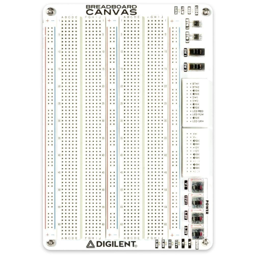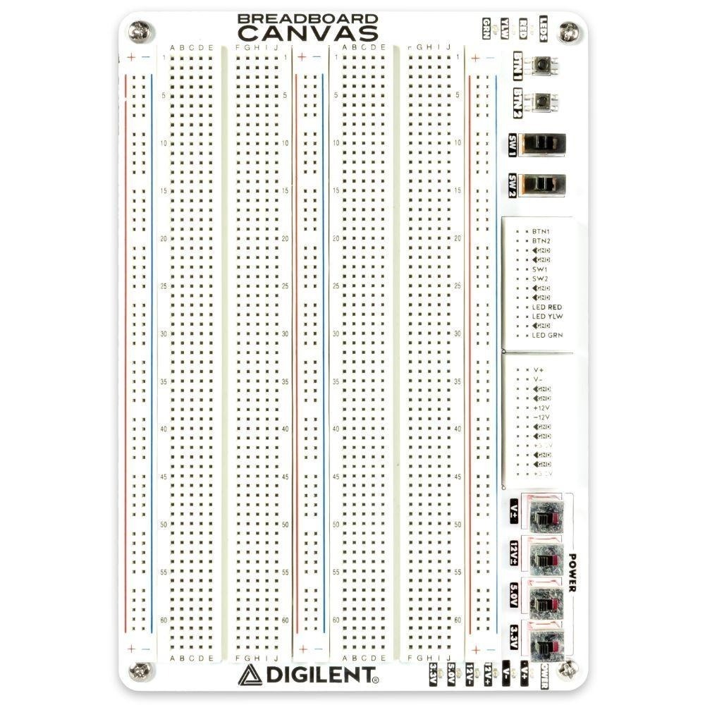 Breadboards are the most common platform for learning and building circuits of all size, but can impact the longevity of your test setup if they are integrated permanently into a test device. The Breadboard Canvas is a replaceable physical interface for the Analog Discovery Studio centered around a large breadboardable area. In a lab setting or at home where the Analog Discovery Studio will get lots use with multiple projects, the Breadboard Canvases can be easily replaced or swapped out for multiple projects via the magnetic interface. This provides a convenient way to demonstrate multiple projects without having to disassemble circuits or share the device between multiple students where they each have their own Canvas. If the breadboard, integrated switches buttons or LEDs get damaged, the Canvas can quickly and easily be replaced protecting the long term investment in the Analog Discovery Studio. The Breadboard Canvas features a large breadboardable surface with two regular sized solderless breadboards appropriate for medium to large circuits. Two small breadboards provide connection to the six available power supplies (3.3V, 5V, ±12V, and ± variable), and connections to the included I/O. Two switches, LEDs, and buttons have been included on the Breadboard Canvas to provide these typically hard to breadboard components with an easy-to-use interface. Each of the power supplies can be switched on and off via slide switches to make powering off and on circuits as convenient as possible. Power supply status is indicated by the power indicator LEDs. This is the same Breadboard Canvas that is included with the Analog Discovery Studio.