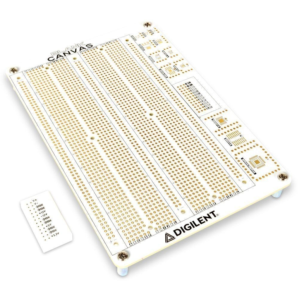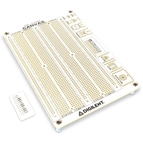 The Blank Canvas provides a prototyping surface in the configuration of two 630 tie point breadboards for the Analog Discovery Studio and connections to the six power supplies (3.3V, 5V, ±12V, ± variable). The large prototyping surface has been wired in the configuration of two standard breadboards with 3 power rails for convenience. The connections to the power supplies are available as copper pads that can be soldered on directly, or the included power supply breadboard can be soldered on for a solderless connection. Eleven breakouts are provided at the top of the board for common IC package types. A custom breadboard for the power supply connections is included, and two solderless breadboards can be optionally added to provide a solderless breadboard surface.