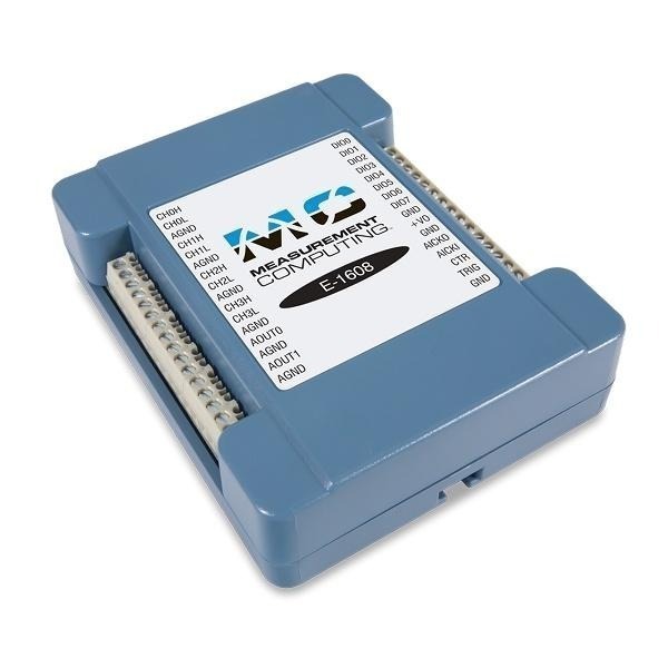 The E-1608 features 8 SE/4 DIFF analog inputs, 16-bit resolution, 250 kS/s sample rate, two 16-bit analog outputs, eight digital I/O, and one 32-bit counter input.Software support includes free DAQami software for out-of-the-box data logging, viewing of data, and generating signals. Also freely available are drivers for the most popular applications and programming languages including Visual C++®, Visual C#®, Visual Basic®.NET, DASYLab®, LabVIEW™, Linux®, and Python™. What's Included: Ethernet Cable 1M Power Supply, 5 VDC Output Field Changeable AC Input Plug (USA style is included, other types may be purchased separately) Printed insert: DAQami Quick Start MCC packaging assembly/foam, etc.