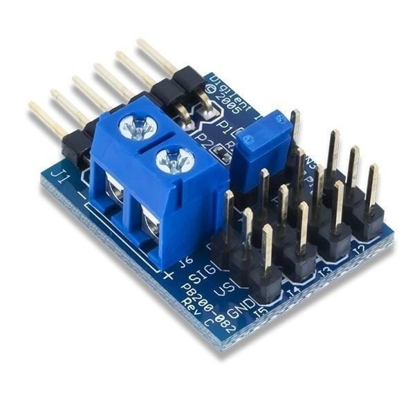 The Pmod CON3 can be easily used to interface with up to four small servo motors that deliver anywhere from 50 to 300 ounce/inches of torque, such as those used in radio controlled airplanes or cars, as well as some mechatronics projects. The power supply can be sourced either from the system board or an external power source via a pair of screw terminals. Features: Four standard 3-wire servo motor connectors Easily interface with Digilent system boards Flexible power delivery to servos Small PCB size for flexible designs 1.0 in × 0.8 in (2.5 cm × 2.0 cm) 6-pin Pmod connector with GPIO interface Follows Digilent Pmod Interface Specification Type 1 Example code available in resource center What's Included: Pmod CON3 Custom antistatic Pmod packaging