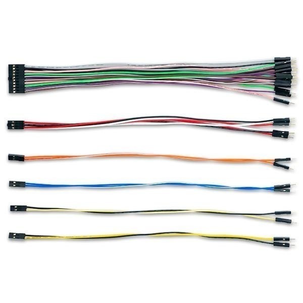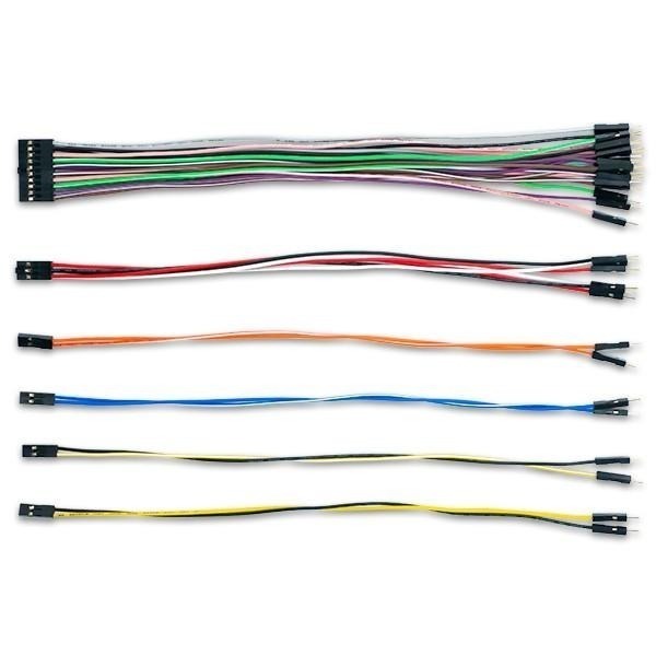 The Analog Discovery Studio MTE (Measurement and Test Equipment) cables are the same MTE cables that ship with the Analog Discovery Studio. This set of six cables features male-terminated flywires are perfect for connecting signals to circuits on the Breadboard Canvas. The Power Supply MTE cable is a keyed 2x3 cable that provides access to the ±12V (red, white), variable supplies (red, white), and ground (Black). The channel one oscilloscope MTE cable is used for making differential measurements and is a 2x1 cable with a connection for the positive (orange) and negative (orange/white) oscilloscope channels. The channel two oscilloscope MTE cable is used for making differential measurements and is a 2x1 cable with a connection for the positive (blue) and negative (blue/white) oscilloscope channels. The channel one waveform generator MTE cable is a 2x1 cable and provides access to channel one of the waveform generator and ground. The channel two waveform generator MTE cable is a 2x1 cable and provides access to channel two of the waveform generator and ground. The Digital MTE connector is a 2x10 cable and provides access to the two triggers (grey and grey/white), two grounds (black), and 16 Digital I/O (pink, green, purple, brown, pink/white, green/white, purple/white, brown/white... repeated). Note: The oscilloscope and waveform generator can also be accessed via BNC connectors for single-ended measurements. Features: 2x1 channel one oscilloscope MTE cable (orange, orange/white) 2x1 channel two oscilloscope MTE cable (blue, blue/white) 2x1 channel one waveform generator MTE cable (yellow, black) 2x1 channel two waveform generator MTE cable (yellow/white, black) 2x3 power supply MTE cable (red, white, black) 2x10 digital I/O MTE cable (grey, grey/white, pink, green, purple, brown, pink/white, green/white, purple/white, brown/white... repeated)