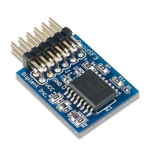 The Pmod SF3 provides users with 32 MB of non-volatile memory through the use of Micron's NOR Flash memory (N25Q256A). By using the SPI protocol, users can both write to and read from the flash memory. Features: 32 MB serial NOR Flash memory Supports extended SPI protocol, dual I/O, and quad I/O Minimum 100,000 erase cycles per sector Small PCB size for flexible designs 1.0“ × 0.8” (2.5 cm × 2.0 cm) More than 20 years data retention Follows Digilent Interface Specification Type 2 What's Included: Pmod SF3 Custom antistatic Pmod packaging