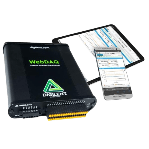 There are three devices in the WebDAQ Series. Devices are available to log multiple signal types including voltage (up to +/-60 V), thermocouples, IEPE-based sensors like accelerometers, current, RTDs, resistance, and bridge-based sensors.