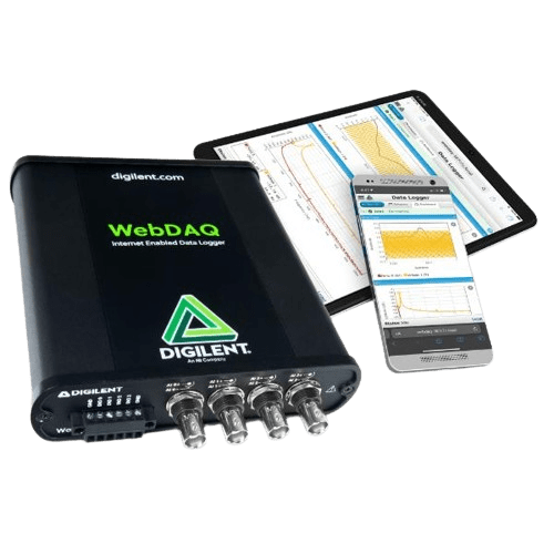 There are three devices in the WebDAQ Series. Devices are available to log multiple signal types including voltage (up to +/-60 V), thermocouples, IEPE-based sensors like accelerometers, current, RTDs, resistance, and bridge-based sensors.