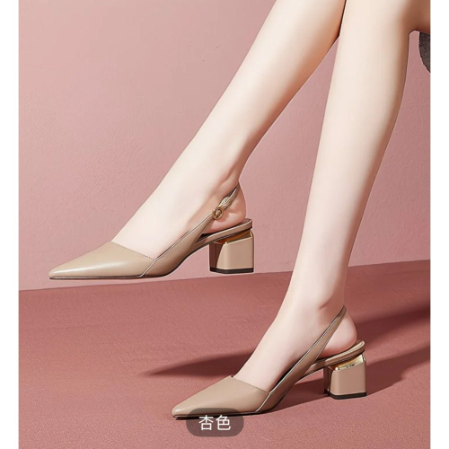 一字帶真皮中跟包頭凉鞋 尖頭時尚粗跟高跟鞋👠