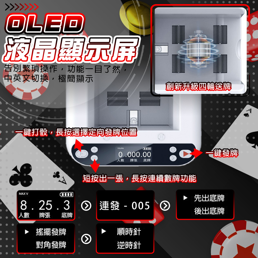 1.短按一次即可開機,長壓時即可關機擇模式時 中途按壓就會回歸初始畫面的面板狀態(發牌途中也是)