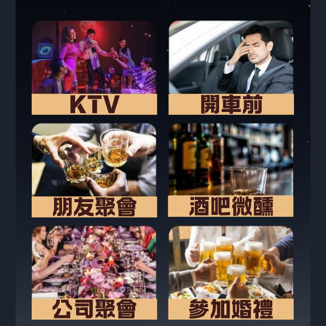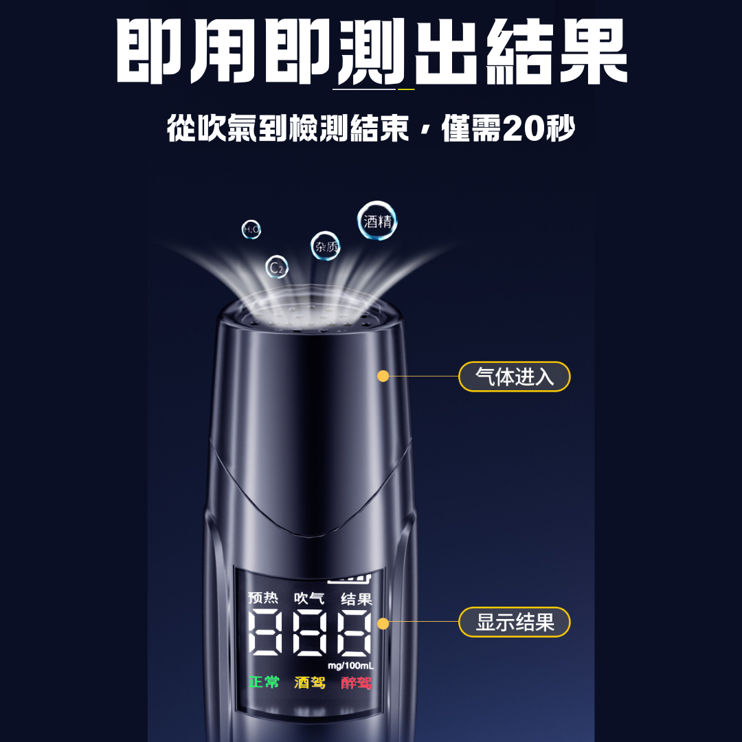 測試時機: 飲酒後請務必間隔 20 分鐘 再測試,此時酒精進入血液,檢測結果最具參考價值。