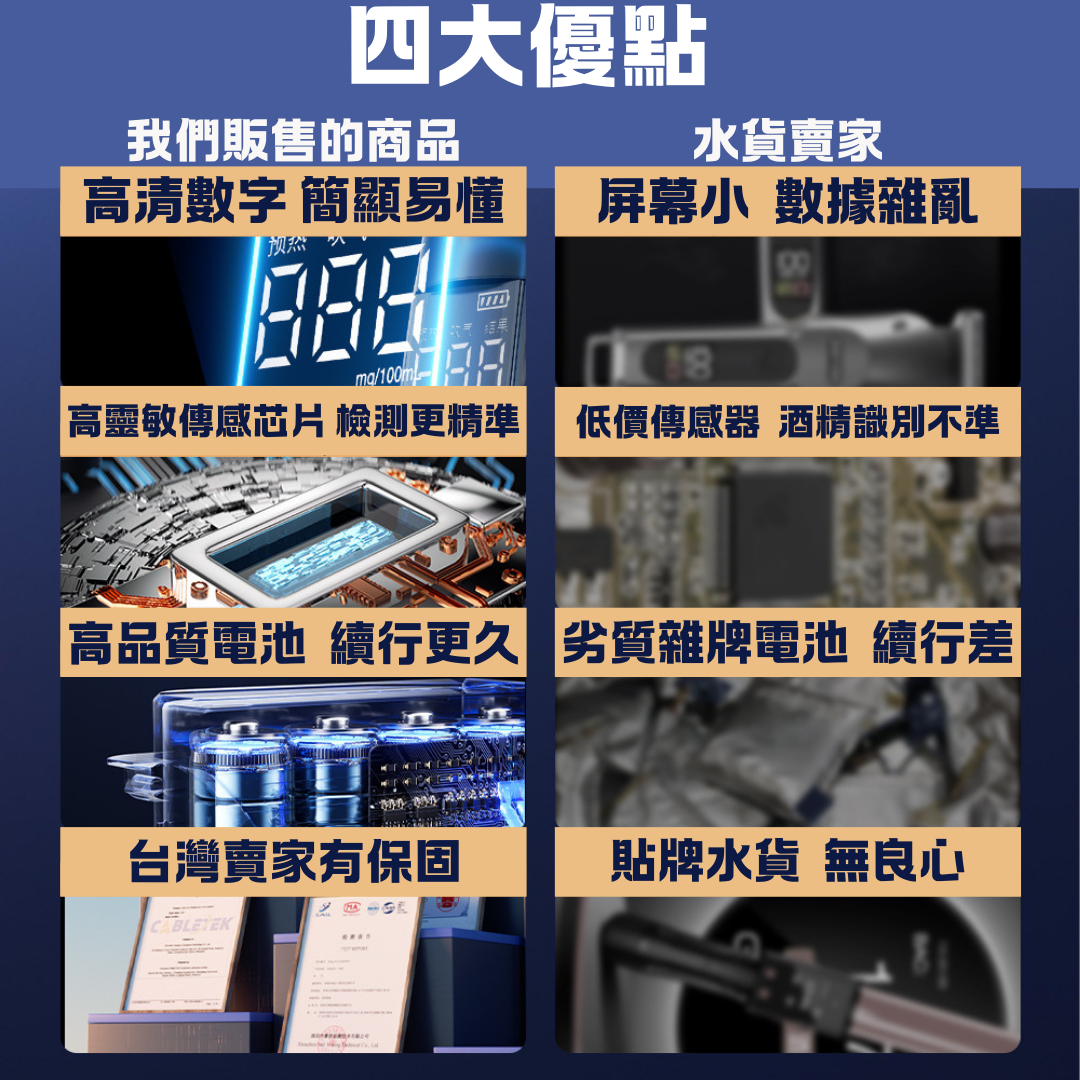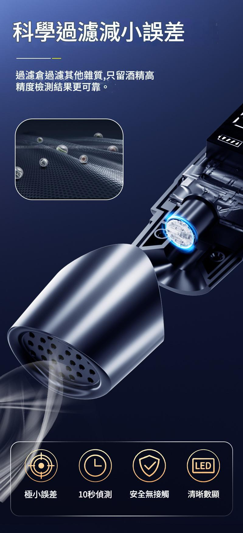 A:關鍵在「芯片」!便宜貨常因傳感器等級低導致數據亂跳。我們使用台灣賣家保固的高靈敏芯片,並內置科學過濾倉,能過濾非酒精氣體,數據更精確。