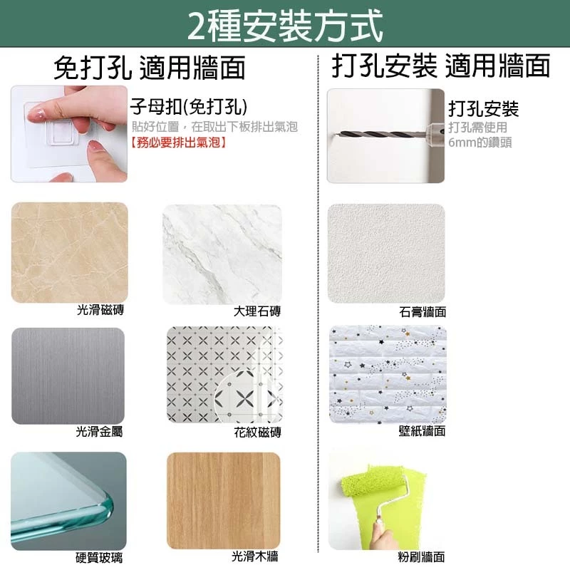 🍭 免打孔(子母扣)安裝承重:5公斤以內