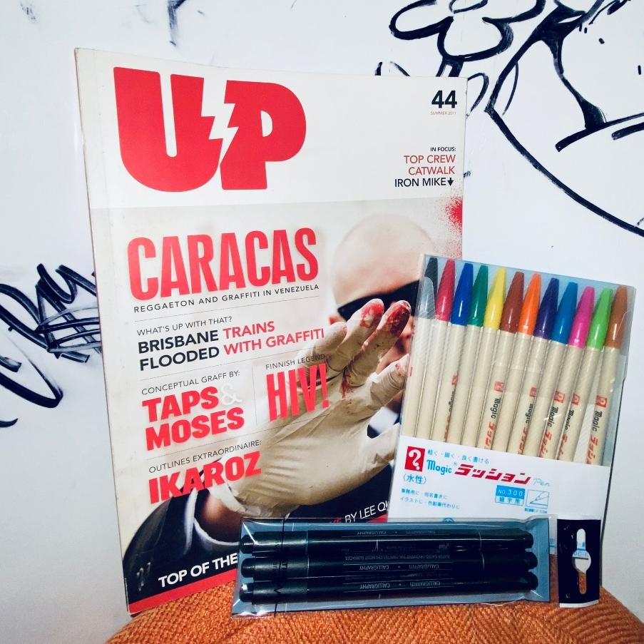 思勃鋭肯 草稿組合包內含: UP MAGAZINE 塗鴉雜誌一本(隨機配送期數,若售完將替換為等值商品雜誌) 寺西化學 - MAGIC INK 草稿用水性色筆12色 Beating Markers twin marker 雙頭英文書法麥克筆三入組 (黑、藍) 三合一供你紙上畫稿、參考兩相宜。