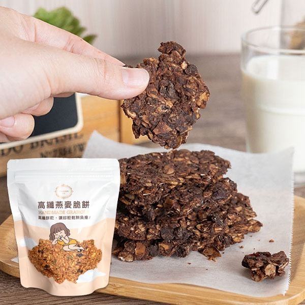 巧克力高纖燕麥脆餅添加益生菌促進腸道健康! 並選用法芙娜水滴巧克力增添香味口感。 嚴選大燕麥片、非基因改造豆漿、優質黑糖, 精心挑選的美味食材、享受最優質的美味! 低溫烘烤保留大量營養,並擁有多層次的酥脆口感, 當早餐下午茶都很棒,讓不健康的高熱量零食通通OUT!