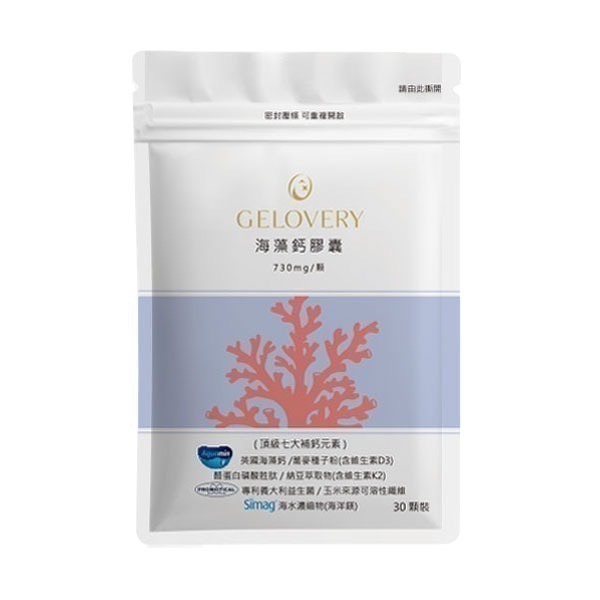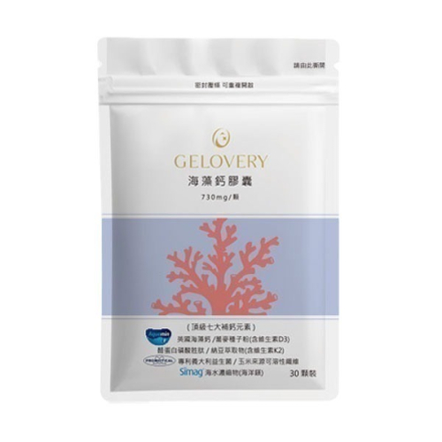 Gelovery 海藻鈣D3膠囊榮獲2024世界品質金獎🏆 全家補鈣首選,無論是孕婦、哺乳期媽媽、小朋友還是成人, Gelovery海藻鈣D3膠囊都是理想的補鈣產品! 每份膠囊含有1350 mg專利海藻鈣,鈣純量高達32%,相當於每份含432 mg鈣。 🎯 使用建議: 孕婦及哺乳期媽媽:可安全食用 小學以前兒童:一天1顆 小學生:一天2顆 國中及成人:一天3顆 專為全家設計的海藻鈣,從小到大、從孩子到長輩都能安心補充鈣質, 守護健康每一天! 【產品規格】 單包30顆,每份3顆,共10份。 包裝尺寸:10.5x16.5cm 【關鍵成份(每份)】 專利海藻鈣 1350 mg(內含鈣純量32%,鎂純量2.2%) 專利蕎麥粉D3 60mg (維生素D含量600 I.U.) 酪蛋白磷酸胜肽 225 mg 專利納豆(K2) 20.1 mg 專利義大利益生菌 42 mg 纖維輔料 105 mg 海水濃縮物(海洋鎂) 150 mg (鎂純量55%) 【使用方式】 1. 每日3顆,搭配常溫水使用,餐後使用更佳。 2. 若想改善睡眠或睡眠中抽筋症狀,可移至睡前使用。 【警語】 本產品含有牛奶、大豆及其製品,不適合對其過敏體質者食用