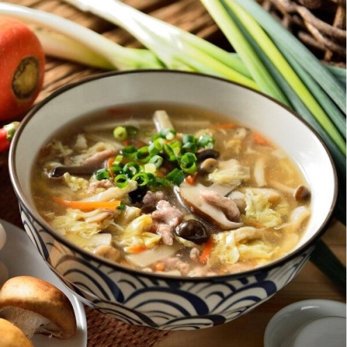 食材採用菇類(香菇、草菇、秀珍菇)、台灣溫體豬、紅蘿蔔、雞蛋,再加上黑醬油做提味,中火侯慢煮,即完成百菇大滷湯。百菇可以降血壓、血脂、消疲勞、增強免疫力…等好處;身處工作忙碌的您,推薦您來一碗百菇大滷湯,身體滿足低負擔。