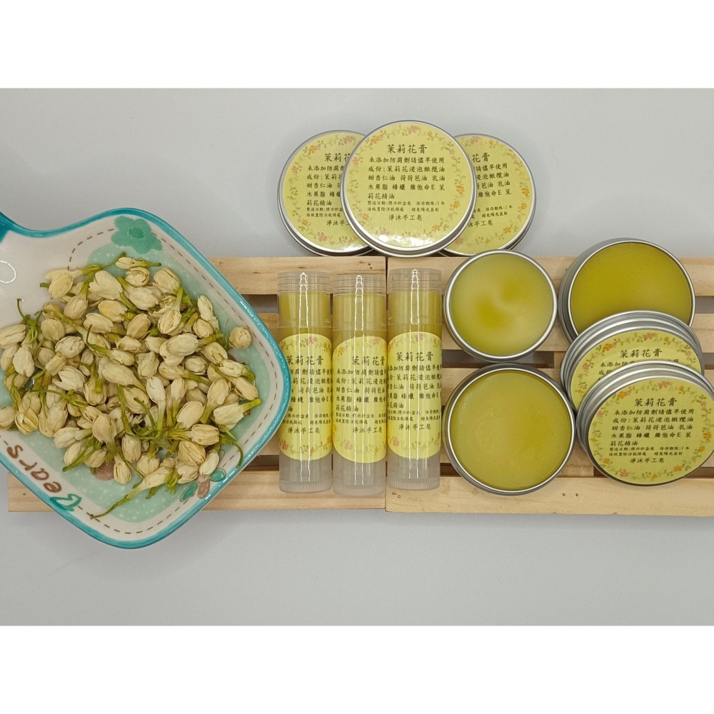 茉莉花浸泡橄欖油 甜杏仁油 荷荷芭油 蜂蠟 乳油木果脂 維他命E 薄荷腦 茉莉花精油(薄荷款)