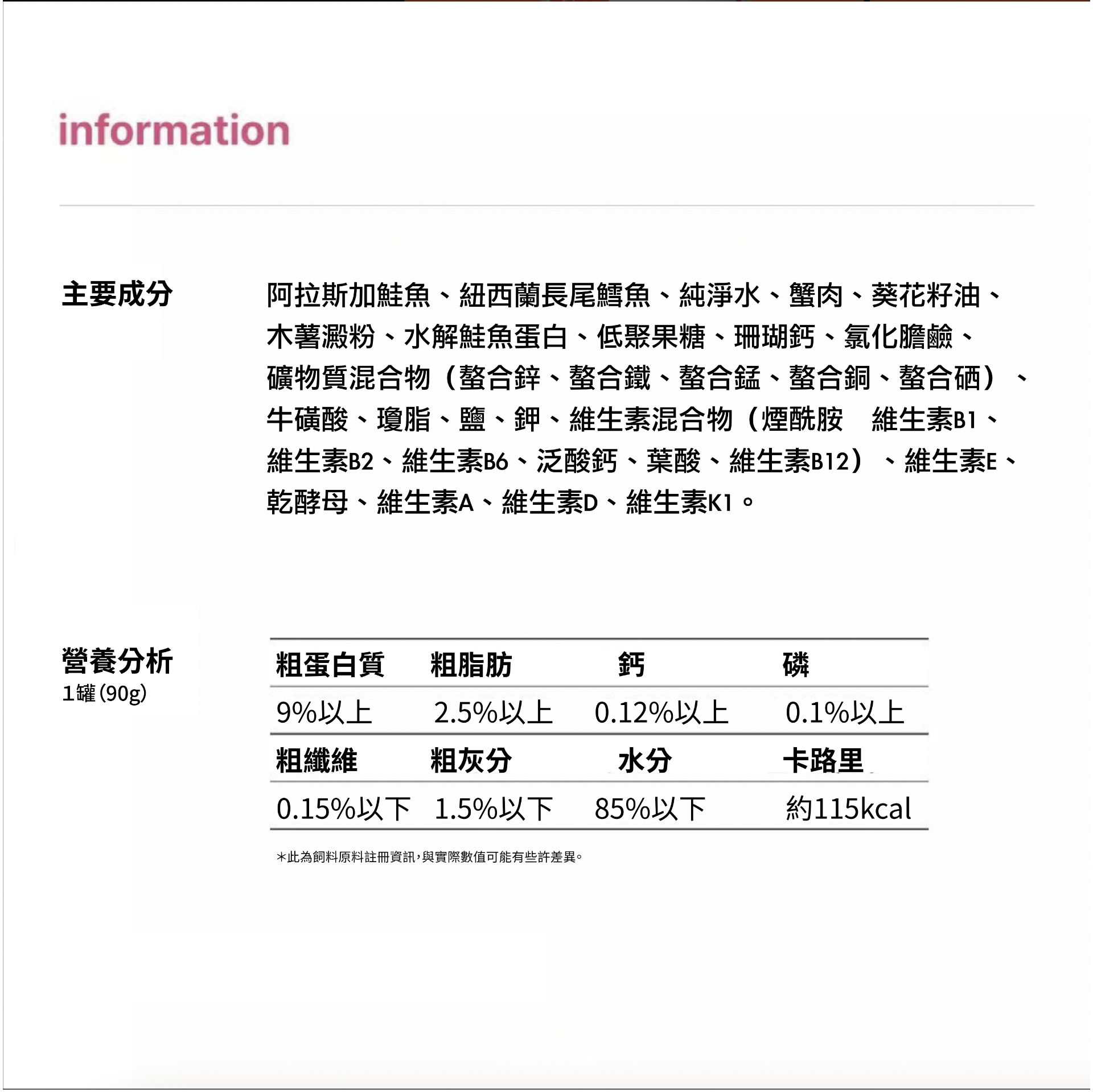 原料成分:阿拉斯加鮭魚、紐西蘭長尾鱈魚、純淨水、蟹肉、葵花籽油、木薯澱粉、水解鮭魚蛋白、低聚果糖、珊瑚鈣、