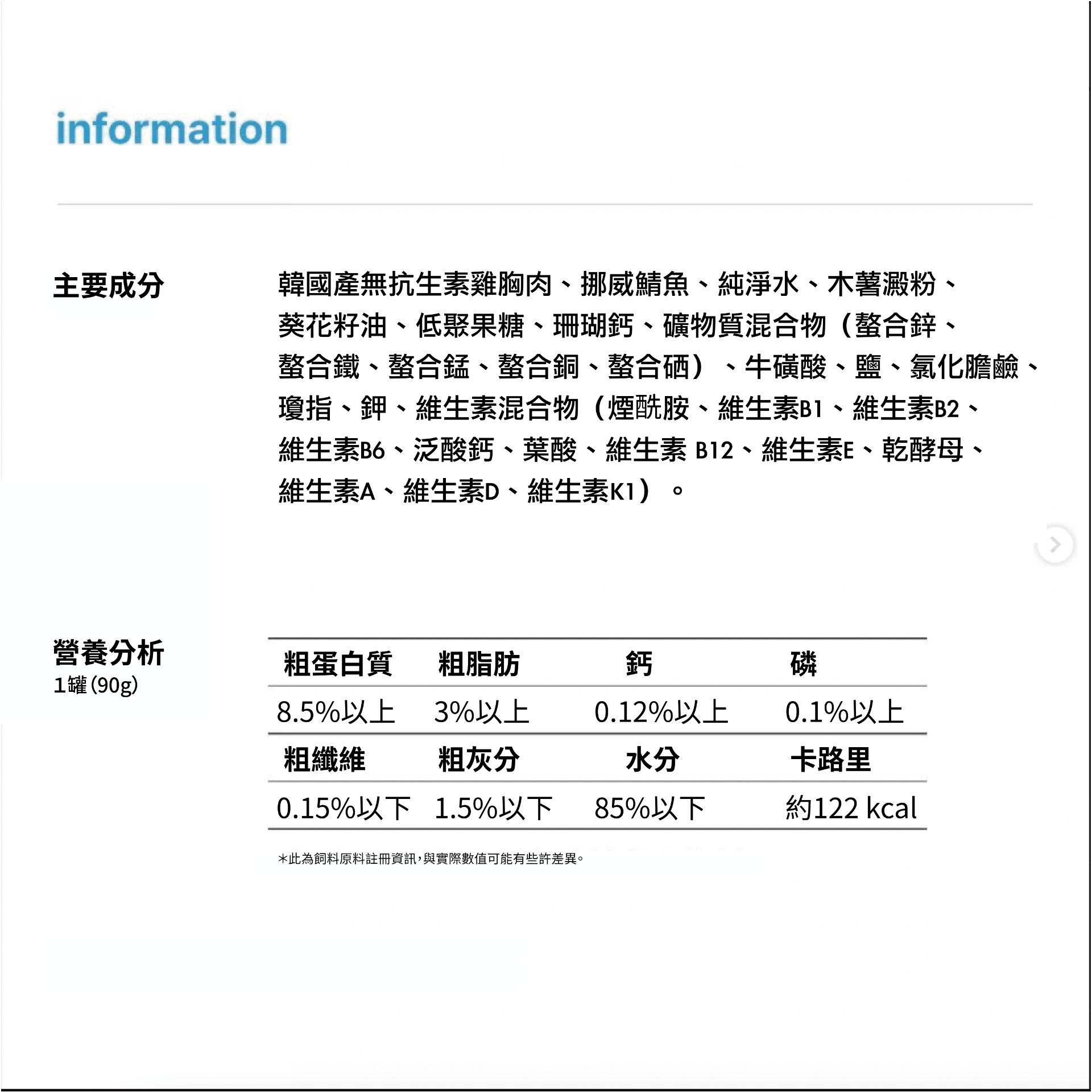 原料成分:韓國產無抗生素雞胸肉、挪威鯖魚、純淨水、木薯澱粉、葵花籽油、低聚果糖、珊瑚鈣、礦物質混合物(螯合鋅、螯合鐵、螯合錳、螯合銅、螯合硒)、牛磺酸、鹽、氯化膽鹼、瓊脂、鉀、維生素混合物(菸鹼醯胺、維生素B1、維生素B2、