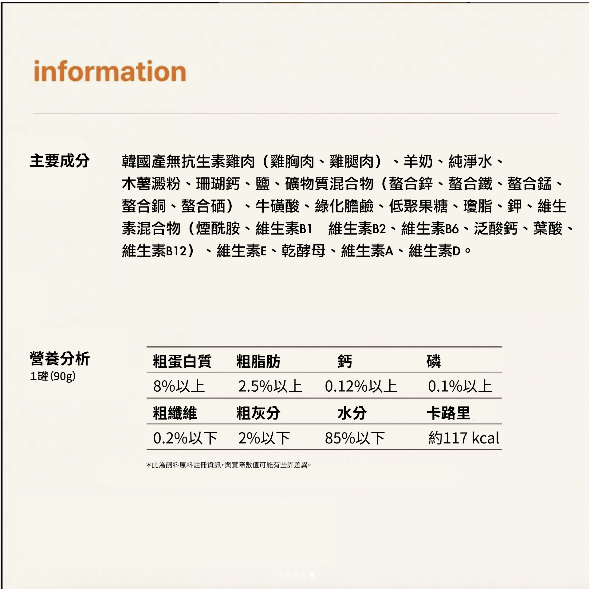 原料成分:韓國無抗生素雞肉(雞胸、雞腿)、羊奶、純淨水、木薯澱粉、珊瑚鈣、鹽、礦物質混合物(螯合鋅、螯合鐵、螯合錳