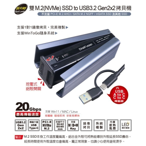 伽利略 雙M.2(NVMe) SSD to USB3.2 Gen2x2 拷貝機 (DMC322B)