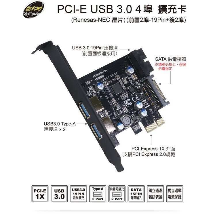 伽利略 PCI-E USB3.0 4埠 擴充卡 Renesas-NEC 晶片 (PEN219)