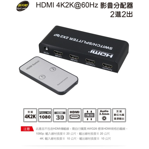 伽利略 HDMI 4K2K @60Hz 影音分配器 2進2出(HDS202B)