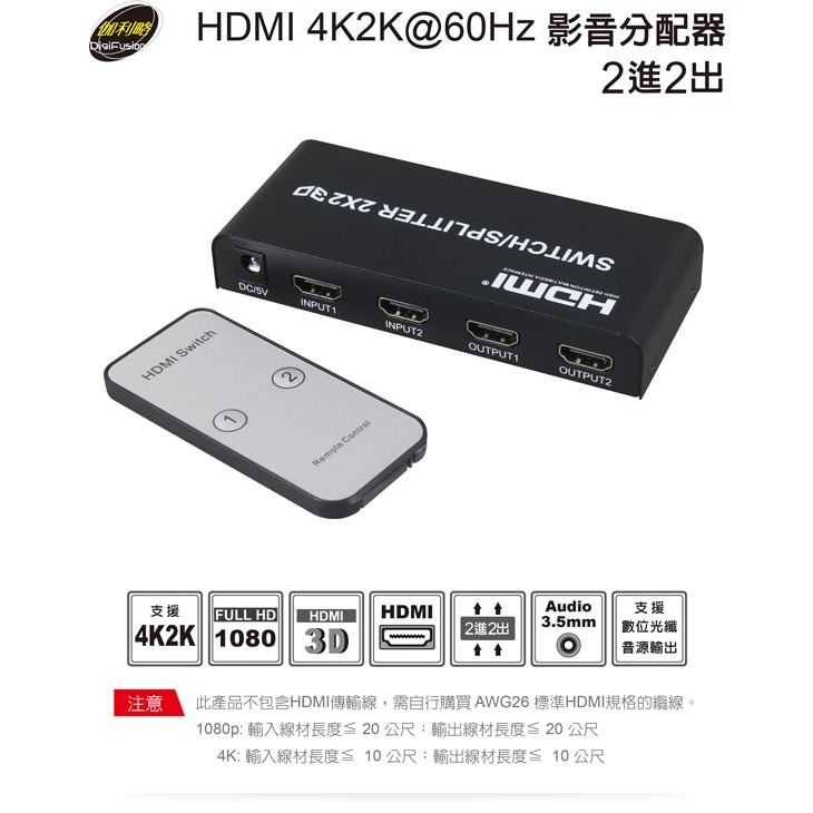 4K: 輸入線材長度 ≦ 10公尺;輸出線材長度 ≦ 10公尺