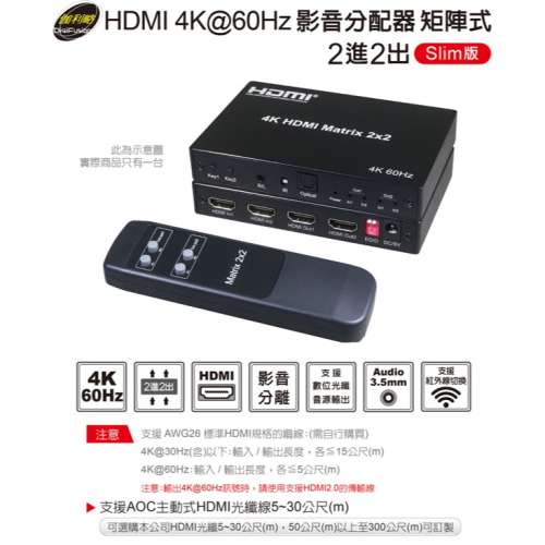 伽利略 HDMI 4K@60Hz 影音分配器 矩陣式 2進2出 Slim版 (HDS202BS)