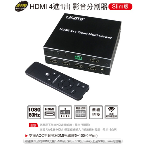 伽利略 HDMI 4進1出 影音分割器 Slim版(HDS401AS)