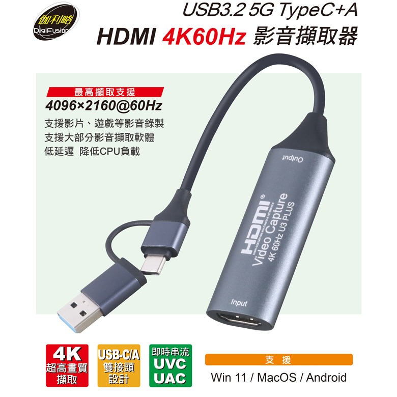 伽利略 USB3.2 5G TypeC+A HDMI 4K60Hz 影音擷取器 (U346C)