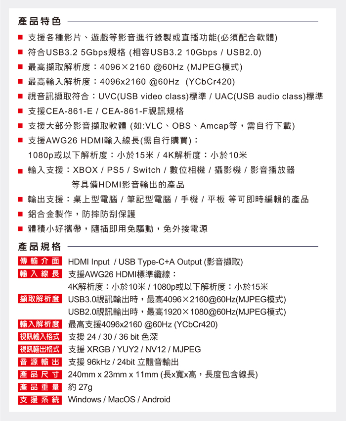 ● 符合USB3.2 5Gbps規格,擷取解析度最高支援4K@60Hz