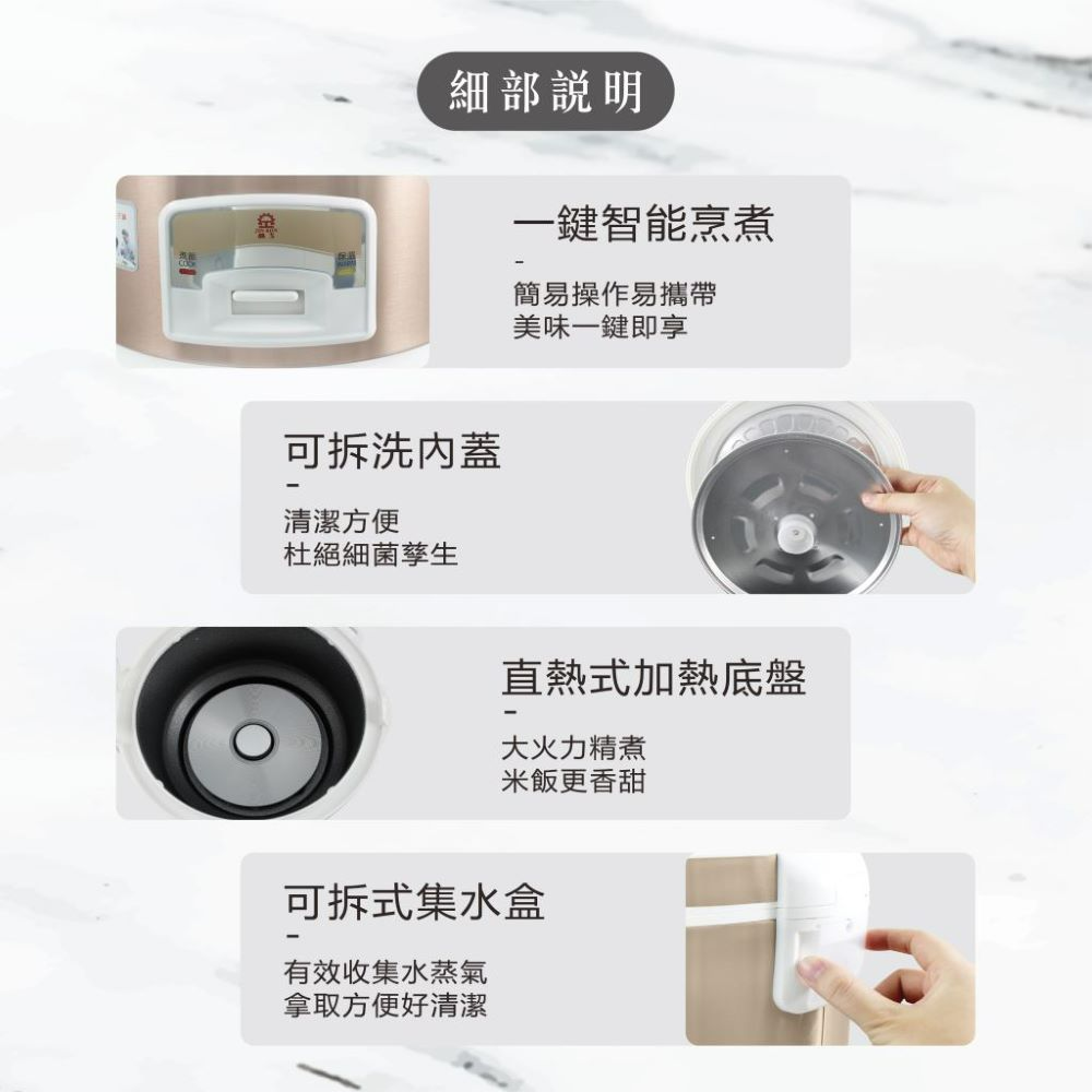 (1) 可拆式內蓋,直熱式炊飯設計,使米飯更加香Q。