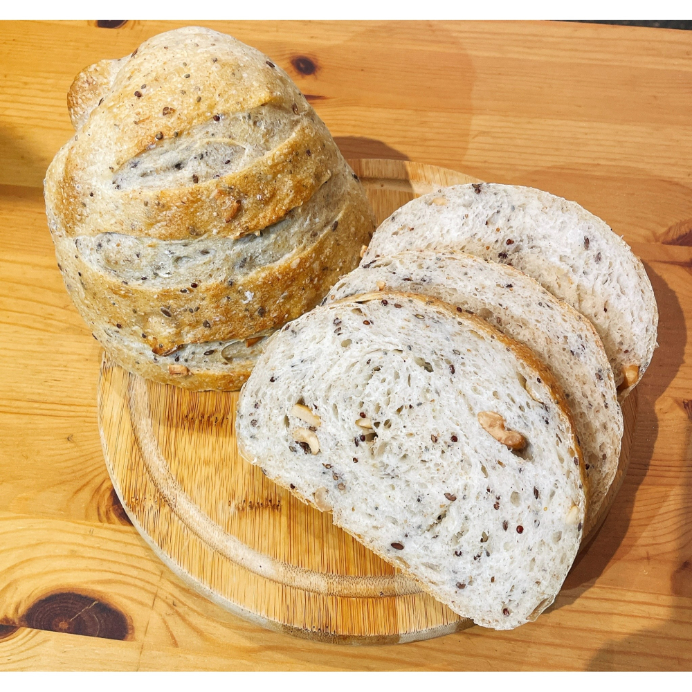 採用 自養天然酵母 宜蘭有機種植糙米 法國石磨全麥粉 成分單純無添加的高筋麵粉 低溫烘烤腰果 多種超級食物 莧籽 紅藜麥 奇亞籽 亞麻籽 西班牙日曬海鹽 無油無糖添加